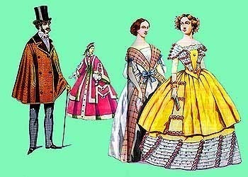Мужчина на рисунке одет в расширяющееся от плеча вниз двубортное пальто длиной "три четверти" с широкими лацканами и обработанными тесьмой разрезами для рук. Брюки узкие, со штрипкой, проходящей под подошвой; шелковый цилиндр венчает голову с завитыми согласно моде волосами и бакенбардами.